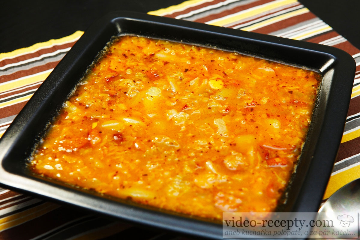 - Najlepšie je rozmiešať všetko metličkou. Potom pridáme asi 5 veľkých, na kúsky nakrájaných surových zemiakov, nakrájanú kapustu a doplníme vodou približne na 2,5 litra.