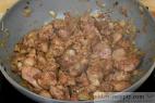 - Potom prihodíme kuraciu pečeň, ktorú pri rovnakej teplote restujeme a zároveň pridáme 1/4 lyžičky korenia, 1/4 lyžičky mletej rasce, 1 lyžičku sušenej zeleniny a 1/2 lyžičky mletého koriandra. Restujeme asi 5 minút a potom prejdeme k ďalšiemu kroku. Ak by tekutiny bolo podozrivo málo, tak ju dolejeme, ale len malé množstvo.