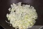 2. Na panvicu nalejeme asi 2 mm oleja a na ňom pri 120°C osmažíme cibuľku dozlatista. Občas ju zamiešame ale nikdy ju nesmažíme pri vysokej teplote. Cibuľka by bola horká a stratila by charakteristickú vynikajúcu chuť. Keď začne pri miešaní šuchotať, je hotová.